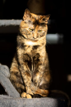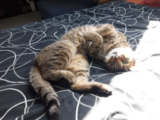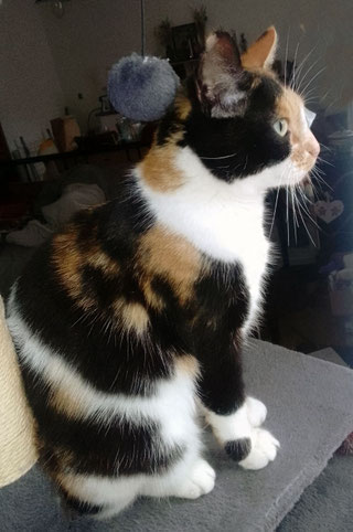 Ultra craintive, arrivée sauvage, elle accepte maintenant de rester dans la même pièce que son humaine, et de manger dans sa main, ......mais cela a nécessité des mois de sociabilisation !
