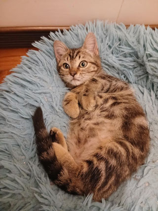 Apple a environ 2 mois et demi, 3 mois, et biensur elle aime jouer et apprécie les câlins.