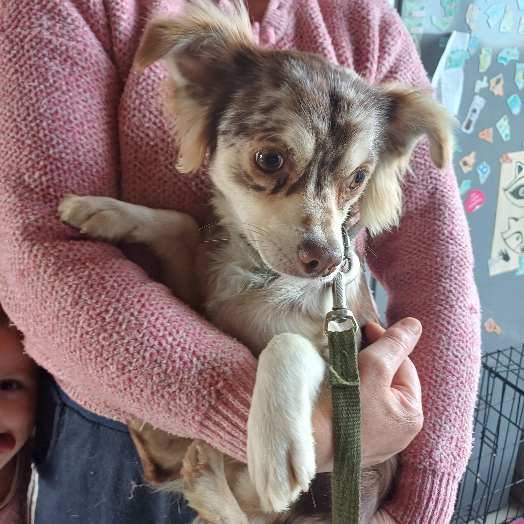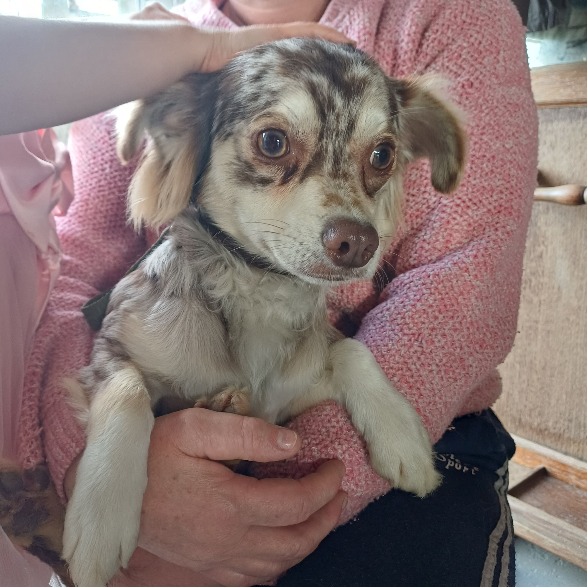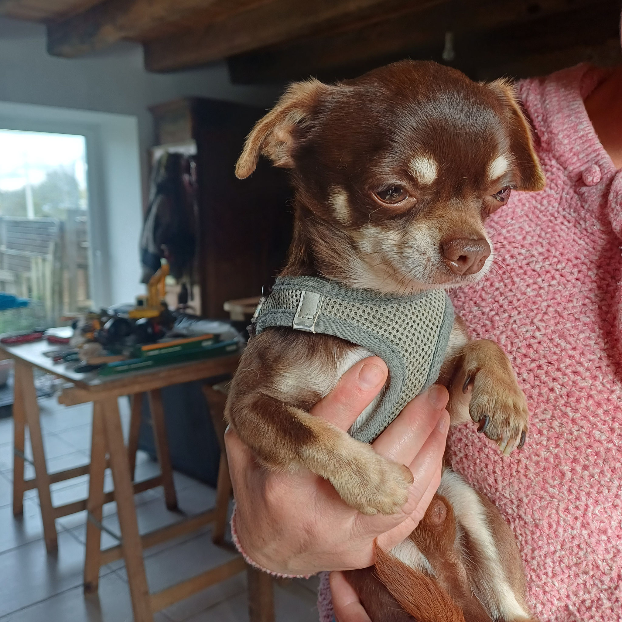 Pourtant aucune agressivité chez ce petit chihuahua qui ne demande qu'à apprendre : la marche en laisse, la confiance en l'être humain et plein d'autres choses ...les câlins.